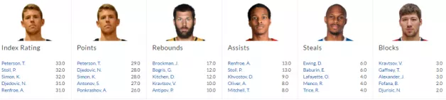 Individualni vrhunci Peterson je bil v tokratnjem krogu s 29 točkami tudi najbolje strelsko razpološen košarkar, medtem ko je najbolje skakal Johnatan Brockam (Ludwigsburg), ki je ujel kar 17 žog in s tem izenačil lasten rekord sezone, ki ga je postavil v novembru. Renfroe in Stoll si delita naziv najboljšega podajalca kroga, saj sta oba soigralce uspešno zaposlila po 13-krat. Ko je govora o ukradnih žogah, sta tokrat izstopala Evgeni Baburin (Nizhny) in Daneil Ewing (Neptunas), ki sta nasprotnikom izmaknila po 6 žog. Največ nasprotnikov (po tri) so z blokadami tokrat zaustavili Viacheslav Kravtsov (Zaragoza), Tony Gaffney (Hapoel) in Joe Alexander (Sasari)..@TPeterson42 of @AvtodorSaratov earned weekly MVP honors thankss to a great performance! https://t.co/t3EAYVmNOg pic.twitter.com/r3hy1f5DkW