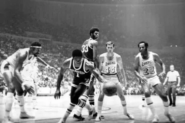 Število legend, ki so nekdaj dominirale v Ligi NBA, na tej fotografiji je zastrašujoče. Wilt Chamberlain, Oscar Robertson, Jerry West, Kareem Abdul-Jabbar, Elgin Baylor, v ozadju pa verjetno še Gail Goodrich. Foto: AP.[/caption]