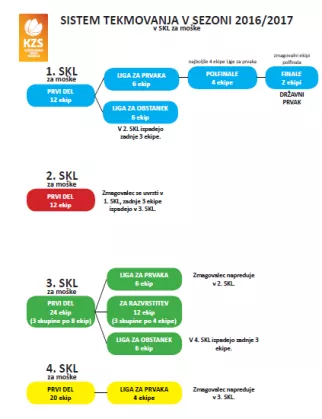 V sezoni 2016/2017 bodo v 1. SKL za moške vse ekipe sodelovale od začetka tekmovanja. Po dvokrožnem sistemu v prvem delu se bo prvoligaško tekmovanje razdelilo na dve skupini s po šestimi ekipami. Najboljše štiri ekipe Lige za prvaka bodo napredovale v polfinale, iz 1. SKL za moške pa bodo neposredno izpadle najslabše tri ekipe Lige za obstanek.