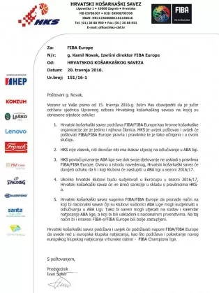Hrvaška košarkarska zveza je Fibi poslala pismo, v katerem...