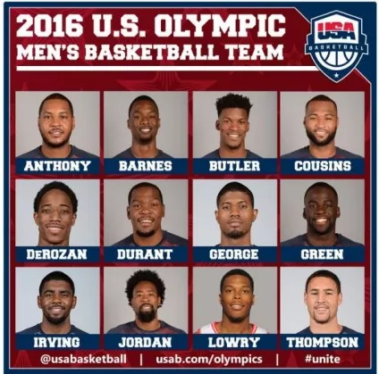 V ekipi sta ostala le dva, ki sta bila zlata v Londonu 2012. To sta Carmelo Anthony (NY) in Kevin Durant (Oklahoma). Poleg njiju pa bodo igrali še Kyrie Irving (Cleveland), Draymond Green, Klay Thompson in Harrison Barnes (vdi Golden State Warriors), Paul George (Indiana), DeMarcus Cousins (Sacramento), DeAndre Jordan (LA Clippers), Jimmy Butler (Chicago), DeMar DeRozan in Kyle Lowry (oba Toronto).
