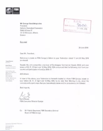 Grška košarkarska zveza, spletna stran EuroHoops pa je objavila, je dobila dopis Fibe Europe, pod katerega se je podpisal izvršni direktor Kamil Novak.