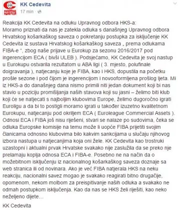 Ob 18.30 so se na odločitev HKS-a odzvali tudi pri Cedeviti: