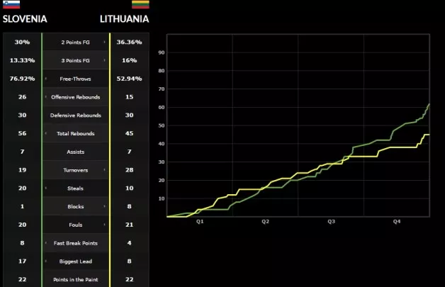 Slovenija: Potočnik 23 (9 skokov), Jakovina 2, Gwashavanhu 7 (8 skokov), Prezelj 16, Lešek 2, Vujačić 4, Ocvirk 5 (17 skokov), Stefanoski 3.
