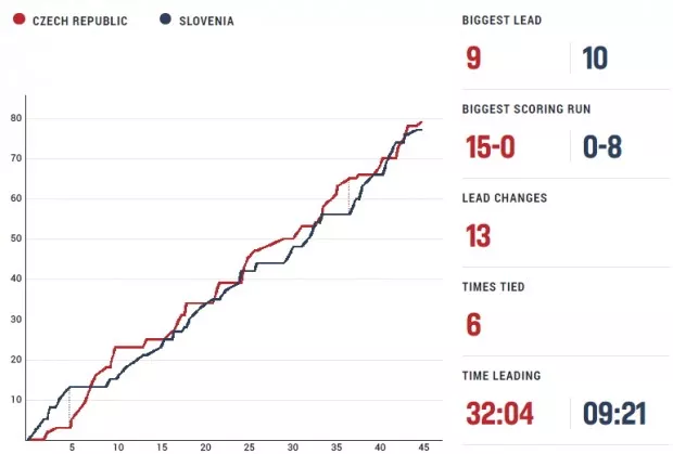 Pred zadnjimi desetimi minutami rednega dela so imeli Čehi pet točk naskoka (45:50). med 34. in 37. minuto so Čehi spet naredili serijo (0:10) in ušli na 56:65. Na krilih Nejca Martinčiča in Jana Kosija je Slovenija izenačila na 66:66, Čehi pa so zgrešili met za zmago.