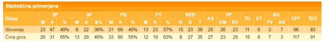 Črnogorcem je stekel met (13/29 za 3, Slovenija le 8/22), prednjačili so tudi v prostih metih in metu za dve točki. Do tretje četrtine so dominirali v skoku, ki ga je na koncu dobila Slovenija (38:35). Črnogorci so zbrali sedem blokad, Slovenija tri, pod košem pa je dominiral trojec Nikola Vučević (20+10), Bojan Dubljević (11+5), Vladimir Dašić (7+3). Za nameček je bil nezgrešljiv za "tri" še Nemanja Vranješ (5/5):