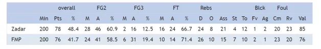 Ob tem velja spomini na mizeren izkupiček FMP-jevega branilca Filipa Čovića (3/15 met iz igre). V dresu Zadra je zablestel Ivan Marinković (32 točk, 8 skokov, indeks: 41).