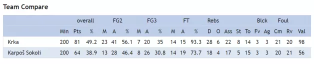 Krka je zadela sedem trojk (7/20), gostje eno več, a so za to porabili 26 žog. Dolenjci so bili zbrani pri prostih metih (14/15), gostje so jih zadeli prav toliko (19 poizkusov).