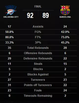 Sinoči je bila na sporedu še druga evroameriška tekma v sklopu NBA Global Games. Oklahoma je tesno z 92:89 porazila Barcelono in se tako ognila drugemu zaporednemu porazu.
