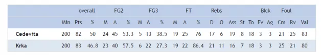 Krka: Rebec 15 (6 podaj), Curry 6 (5 skokov), Rojc 5, Dimec 17 (9 skokov), Čebular 16 (4 skoki, 3 podaje), Ritlop 2, Elliot 2, Luković 20 (4 skoki, 5 podaj).