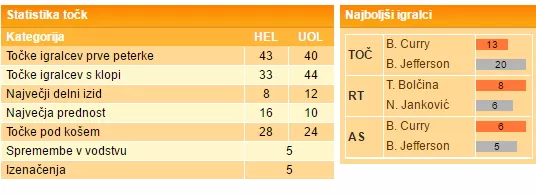 (Curry 13 (6 podaj), Kyzlink 11, Bratec 11, Atanacković 11 (6 skokov); Jefferson 20 (6 prid. žog), Mulalić 19, Janković 12 (6 skokov))