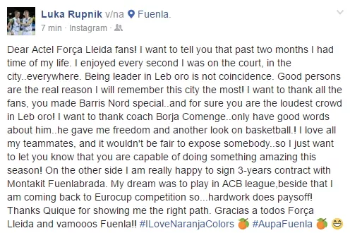 Kluba sta potrebovala nekaj dni, da sta se dogovorila okoli odškodnine. Do sporazuma je prišlo včeraj dopoldan, danes pa je spletna stran Lige ACB obelodanila veselo vest: Rupnik je član Fuenlabrade (do junija 2019!), za katero bo debitiral jutri, v sredo, proti Bilbau (tam igra Rupnikov soigralec iz Olimpije Miha Lapornik), ko se igra 3. krog EuroCupa.