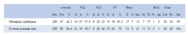 Olimpija v prvem polčasu ni razočarala, 41:43 je bilo po 20 minutah, čeprav so Beograjčani pobegnili na 18:25. Z menjavo obramb so zmedli goste, ki pa so v drugem polčasu pokazali zobe (po 27. minuti) in s serijo 3:13 pobegnili na 53:66 in si zagotovili dovolj visoko prednost za mirno končnico.