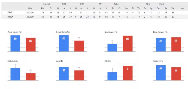Krka je dosegla šest trojk (6/26, štiri je zadel Čebular, po eno pa Ron Curry in Erjon Kastrati), FMP je vknjižil le tri trojke (3/23).