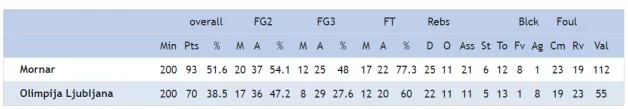 Olimpija Ljubljana: Barbarič 6, Oliver 10, Mulalić 18, Milošević 6, Janković 11, Jefferson 15, Hrovat 4.