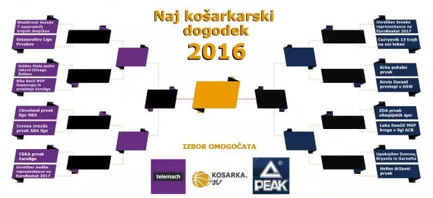 Na portalu Košarka.si smo tudi letos pripravili izbor NAJ košarkarskega dogodka leta 2016, v katerem boste prav vi izbrali dogodek, ki je po vašem mnenju v letu 2016 najbolj zaznamoval košarkarsko sceno doma in po svetu. Izbrali smo 16 najbolj odmevnih košarkarskih dogodkov preteklega leta, z vašo pomočjo pa želimo po sistemu izpadanja dobiti tisti dogodek, ki je po vašem mnenju v preteklem letu najbolj zaznamoval košarkarsko dogajanje doma in po svetu.