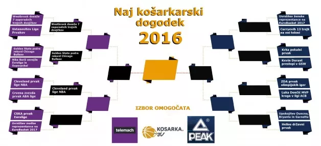 Na portalu Košarka.si smo tudi letos pripravili izbor NAJ košarkarskega dogodka leta 2016, v katerem boste prav vi izbrali dogodek, ki je po vašem mnenju v letu 2016 najbolj zaznamoval košarkarsko sceno doma in po svetu. Izbrali smo 16 najbolj odmevnih košarkarskih dogodkov preteklega leta, z vašo pomočjo pa želimo po sistemu izpadanja dobiti tisti dogodek, ki je po vašem mnenju v preteklem letu najbolj zaznamoval košarkarsko dogajanje doma in po svetu.