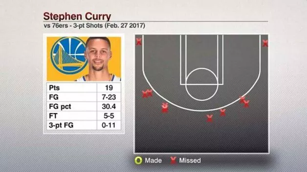 Proti Philadelphiji je Steph metal kar 0-11 in tako izenačil rekord Antoniea Walkaerja iz sezone 2001-2002 in Terya Burkea iz sezone 2014-2015.