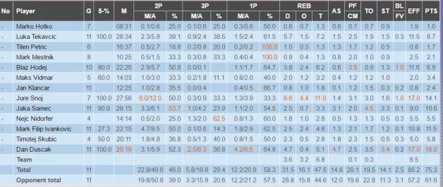 Prvi strelec ekipe je Dan Duščak (18 točk na tekmo), ki je s 4.7 podaje tudi 1. podajalec in najboljši kradljivec žog (3.3), prvi skakale Luka Snoj (11 skokov na tekmo).