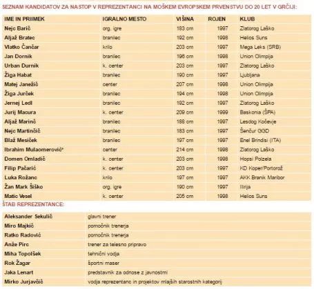 a seznamu selektorja Sekulića je 19 imen kandidatov za nastop na evropskem prvenstvu na Kreti. Med 19 košarkarji trije igrajo v tujih klubih, največ igralcev (4) pa igra v vrstah Zlatoroga. Šest kandidatov za letošnji nastop na evropskem prvenstvu je igralo tudi na lanskem prvenstvu na Finskem, kjer je slovenska četa zasedla deveto mesto. Vlatko Čančar pa je nastopil na zadnjih dveh evropskih prvenstvih do 20 let in je eden izmed kandidatov za nastop tudi na letošnjem EP.