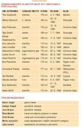 Selektor Damir Grgić je na priprave povabil 16 košarkaric. Šest košarkaric igra pri ekipi Cinkarna Celje, na seznamu pa so tudi košarkarice iz Maribora, Grosupljega, Triglava, Konjic, Ježice in Domžal. Na spisku sta tudi Annamaria Prezelj in Larisa Ocvirk, ki bosta slovenske barve zastopali na bližajočem se evropskem prvenstvu v članski kategoriji.