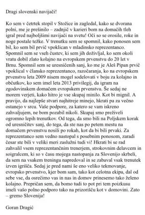 Goran Dragić je mož beseda. Napovedal je slovo, beseda bo držal. Sinoči je zadnji zaigral v dresu Slovenije na slovenskih tleh. Danes popoldan je svoje občutke zlil skupaj in jih tudi objavil. Na tem mestu: GORAN DRAGIĆ, POKLON IN HVALA ZA VSE!!!