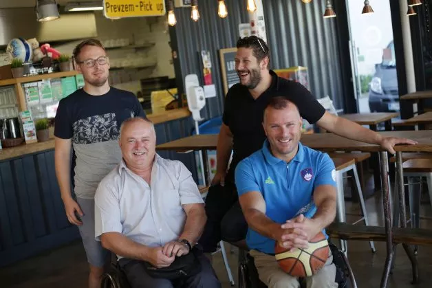 Anže Novak in Simon Ceglar (L&S) ter Danilo Kastelic (Zveza paraplegikov Slovenije) in in Gregor Gračner (kapetan reprezentance in vodja projekta Košarka na vozičkih)[/caption]