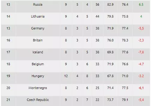 Slovenija se je s 63% uspešnostjo (5 zmag/3 porazi) uvrstila na 11 mesto.[/caption]