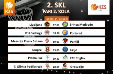 2. SKL, 2. krog, 14.10. Ljubljana - BRINOX MEDVODE 68:77 (13:25, 15:22, 20:14, 20:16) Verbič (6 skokov) in Stemberger (14 skokov) po 15, Berlič 14; Kajnih 13 (8 skokov), Novak (7 podaj), Bradač (7 skokov) in Bunčič (7 skokov) po 12. LTH CASTINGS - Portorož 74:50 (19:16, 13:10, 13:13, 29:11) Strmčnik 20, Mlakar 14, Kralj 13 (8 skokov); Kavgič 16 (16 skokov), Miklavčič 11, Katonar (7 skokov) in Cvetičanin A. po 5. MESARIJA PRUNK SEŽANA - Parklji 81:68 (23:20, 12:13, 19:19, 27:16) Milašinović 26, Urbas 21 (8 skokov), Sirnik 16 (9 skokov); Mlakar 18, Kovačević 15 (7 skokov), Zagorac 12 (7 skokov). Konjice - CELJE 70:75 (18:22, 19:19, 18:20, 15:14) Sevšek 29 (6 skokov), Rat 16 (6 podaj), Meglič 9; Krušič 16 (15 skokov), Zolotić 14, Božak 12. Plama Pur - ECE TRIGLAV 56:70 (22:19, 7:12, 14:15, 13:24) Srebovt 17 (12 skokov), Zalar 10, Muha in Hreščak (7 skokov) po 7; Zdolšek 21, Bešter 13, Kern 9. TERME OLIMIA PODČETRTEK - Grosuplje 90:89 (26:21, 16:23, 27:22, 21:23) Strnad 26 (5 podaj), Cerkovnik 20 (12 skokov), Karavdič 14; Košir 22, Vinazza 19 (5 skokov in 6 podaj), Trampuš 16 (8 skokov).