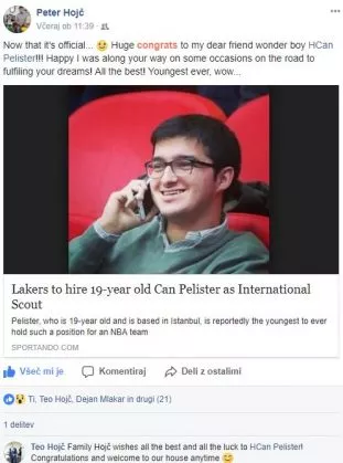 NBA klubi premorejo razvejano mrežo skavtov, ki bdijo nad razvojem evropskih igralcev, ki jih Amerika za drobiž krade Evropi. Med skavte gre po novem šteti tudi 19-letnika Turka, Cana Pelisterja, ki bo po novem skavt pri jezernikih. Pelister je dober prijatelj košarkarskih bratov Petra in Tea Hojča, ki sta fantu prek družbenega omrežja poslala čestitko.