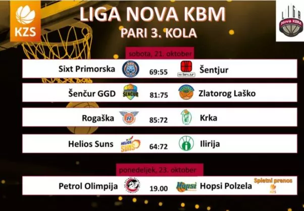 V soboto so bile na sporedu štiri tekme tretjega kola Lige Nova KBM. Šenčur GGD je ugnal Zlatorog, Rogaška je bila boljša od Krke, Ilirija je prišla do prve zmage med elito, Sixt Primorska pa je premagala Šentjur. Tretje kolo bosta v ponedeljek sklenili Petrol Olimpija in Hopsi Polzela.