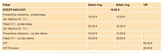 Redna prodaja vstopnic se na prodajnih mestih Eventima in Petrolovih servisih začne v petek, 10. novembra, ob 9. uri. Cena vstopnice je 15 €, možen je tudi nakup paketa 3+1. Na dan tekme je cena vstopnice 18 €.