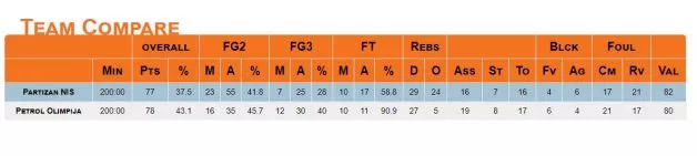 Olimpija v prvem delu ni prepričala. Če odmislimo drugo četrtino, ko je stopila prednost domačina (20:9). Varovanci trenerja Gašperja Okorna so v 1. četrtini metali obupno iz igre (19%), zbrali so eno podajo, domačin šest. V nadaljevanju je bilo boljše, a so dovolili, tudi z norim metom Marinkovića, da Partizan odide na odmor s +10 (45:35).
