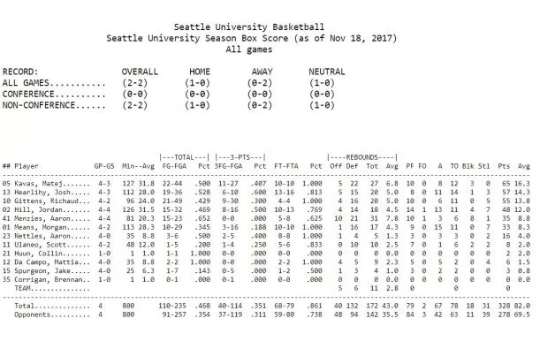 Matej Kavas led all players with 27 pts. Aaron Menzies w/ a 16 pt, 10 rebs.#TogetherWeSoar pic.twitter.com/9NyC3kAuSm — SU Men's Basketball (@seattleumbb) November 18, 2017
