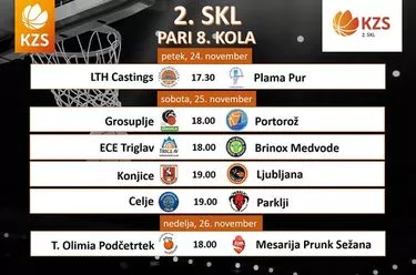 V petek se je začelo osmo kolo 2. SKL. Na prvi tekmi je LTH Castings ugnal Plamo Pur. V soboto Grosuplje pričakuje Portorož, Medvode gostujejo pri Triglavu, Konjice se bodo pomerile z Ljubljano, Celje bo igralo proti Parkljem. V nedeljo bo Podčetrtek igral proti Mesariji Prunk.