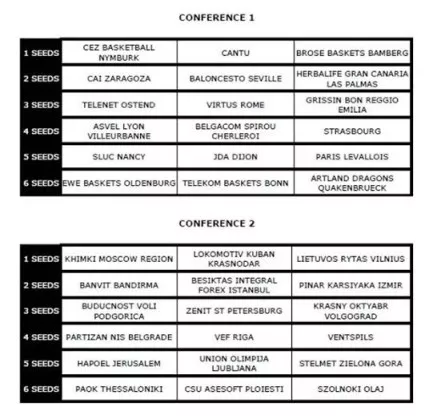V konferenci 1 so klubi: Nymburk (Češka), Cantu (Italija), Brose Baskets Bamberg (Nemčija), CAI Zaragoza (Španija), Baloncesto Seville (Španija), Gran Canaria (Španija), Telenet Ostend (Belgija), Virtus Rome (Italija), Grissin Bon Reggio Emilia (Italija), ASVEL Villeurbanne (Francija), Charleroi (Belgija), Strasbourg (Francija), Nancy (Francija), Dijon (Francija), Paris Levallois (Francija), Oldenburg (Nemčija), Baskets Bonn (Nemčija) in Artland Dragons (Nemčija).