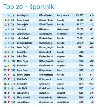 Dragić je na drugem mestu zamenjal še enega košarkarja, znanega širom sveta - Sašo Vujačića, ki je 2-odstotka sledilcev v primerjavi z zadnjo raziskavo celo izgubil. Med dvajseterico slovenskih športnikov z največ sledilci je največ prav košarkarjev, kar osem. Novinca med elito sta Beno Udrih in Jaka Blažič. Poleg omenjene četverice so zraven še Jaka Lakovič, Boštjan Nachbar, Zoran Dragić in Primož Brezec.