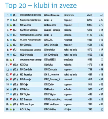 Če so pri posameznikih v ospredju košarkarji, pa to za klube in zveze ne velja. Med dvajsetimi z največ sledilci je najvišje Union Olimpija, ki ji neposredno sledi Košarkarska zveza Slovenije. Na lestvico sta se prebila le še dva kluba - novomeška Krka s slabimi 1500 sledilci na 11. mestu in domžalski Helios Suns z dobrimi 500 sledilci na 16. mestu.