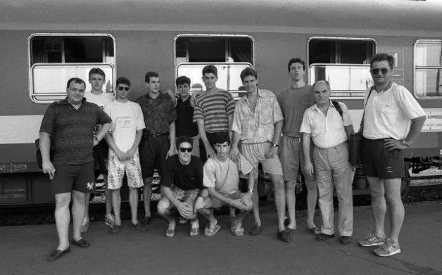 Če vam ni jasno, kdo bi lahko bili gospodje in fantje na fotografiji, priskočimo na pomoč. Tu so trener Duško Vujošević, Željko Rebrača, Nikola Lončar, Dragan Tarlać, Dejan Bodiroga, Mlađan Šilobad, Petar Arsić, Željko Topalović, Borko Radović i Gavrilo Pajović, zdravnik Petar Marković in pomočnik trenerja Kosta Jankov.