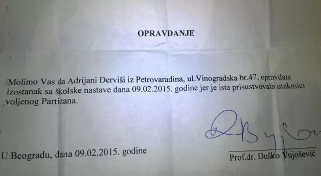 Adrijana iz Petrovaradina se je med šolskimi obveznosti in ogledom tekme Partizan - Levski odločila za slednje, pa čeprav je s tem tvegala morebitne sankcije. Najverjetneje je opravičilo s podpisom Vujoševića nato zadostovalo, da deklica ni imela težav.