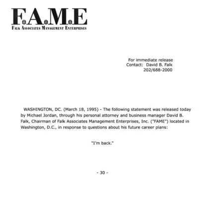 Na današnji dan pred 20 leti je Michael Jordan sporočil, da se po dveh letih odsotnosti in epizodi v baseballu znova vrača v NBA košarko. V sporočilu za javnost je bil kratek in jedrnat: "I'm back" (sem nazaj).