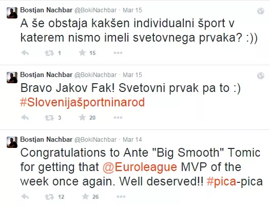 Boki je bil tudi v preteklih dneh med vsemi slovenskimi košarkarji najbolj aktiven na Twitterju. Poleg čestitk Tomiću in Jakovu Faku, se je Boki spraševal, če obstaja kak individualni šport v katerem Slovenci nismo imeli prvaka...
