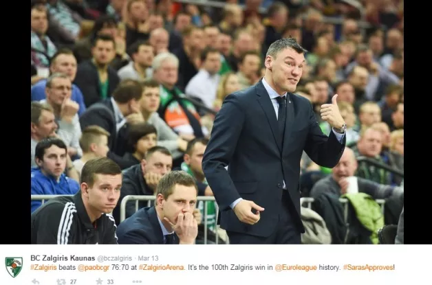 100 zmag med elito Evroliga je na svojem Twitter profilu ovekovečila 100. zmago Žalgirisa iz Kaunas, na klopi katerega sedi legendarni Šarūnas Jasikevičius.