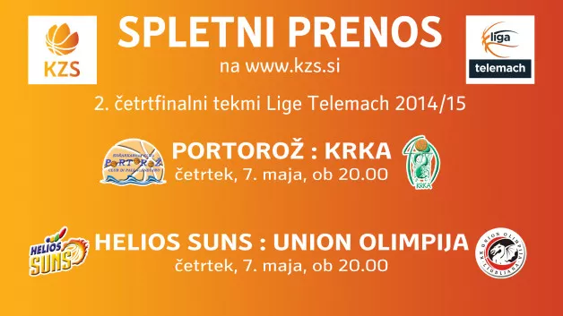 Četrtek prinaša druge četrtfinalne tekme Lige Telemach. Tokrat si boste lahko preko brezplačnega spletnega prenosa ogledali srečanji iz Lucije (Portorož - Krka) in Domžal (Helios Suns - Union Olimpija), obe s pričetkom ob 20. uri.
