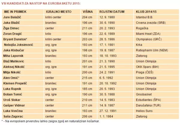 Od enajstih že prej objavljenih kandidatov se bodo namreč zaradi igranja v poletni ligi NBA, po dogovoru s selektorjem, ekipi kasneje pridružili Alen Omić, Gašper Vidmar in Zoran Dragić, ki se zaradi dogovora FIBA-NBA priprav ne sme udeležiti pred 1. avgustom. Status Bryanta Dunstona ostaja nespremenjen, saj je 29-letni Američan še vedno v postopku pridobivanja državljanstva.