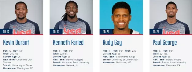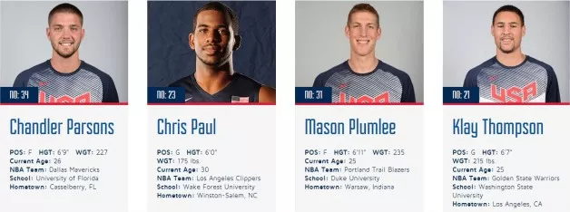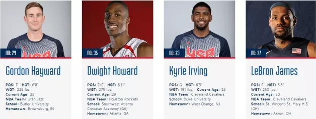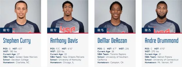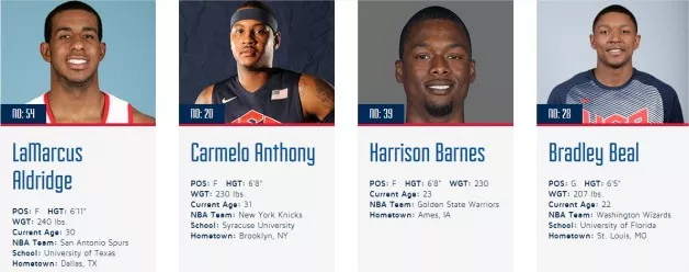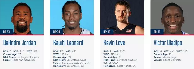 - štirje košarkarji so bili izbrani v prvo peterko lige NBA (James, Davis, Curry in Harden), štirje so bili izbrani v drugo peterko lige NBA (Aldridge, Cousins, Westrbrook in Paul), štirje pa so bili izbrani v tretjo ekipo lige NBA (Griffin, Jordan, Thompson in Irving)