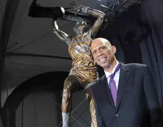 Kareem Abdul-Jabbar pred svojim kipom pred dvorano Staples Center (foto: nba.com)[/caption]