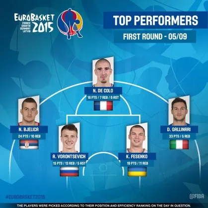 FIBA je na podlagi učinkovitosti na tekmah prvega kola EuroBasketa 2015, izbrala najboljšo peterko uvodnega dne prvenstva. Vanjo so bili uvrščeni Italijan Danilo Gallinari, Srb Nemanja Bjelica, Francoz Nando De Colo, Rus Andrey Vorontsevich in Ukrajinec Kyrylo Fesenko.