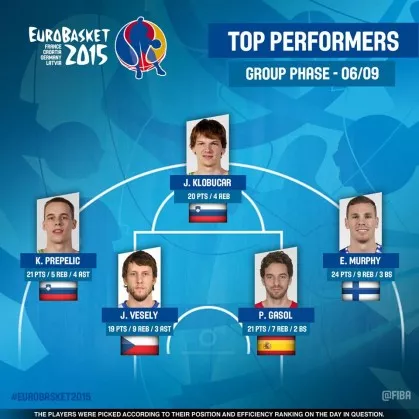 Jan Vesely (Češka) – 26 minut, 19 točk (9/14 za dve, 1/4 PM), 9 skokov, 3 podaje, 1 blokada in 1 pridobljena žoga.