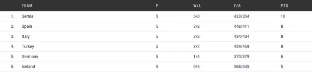 V osmino finala iz skupine B napredujejo Srbija, Španija, Italija in Turčija.